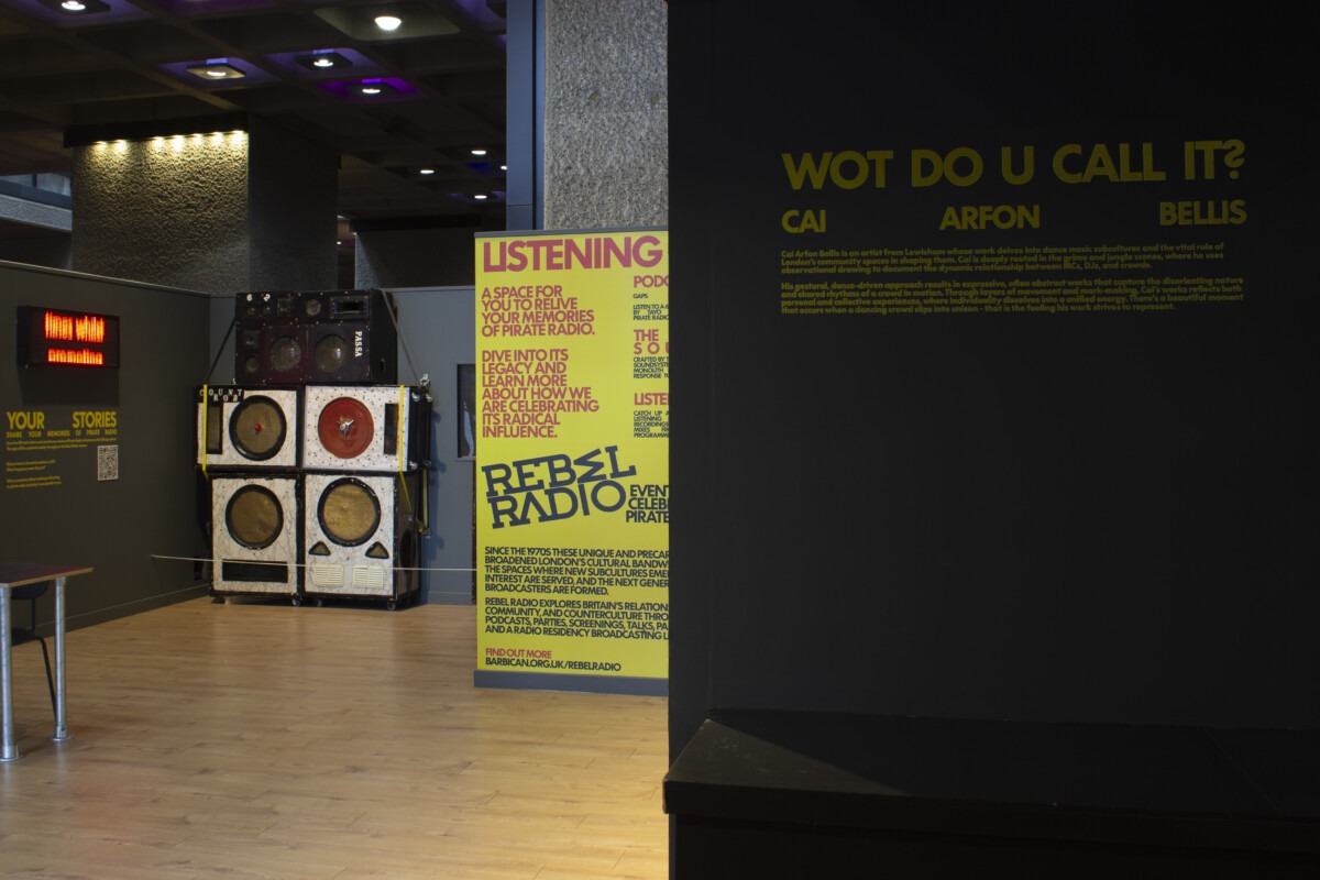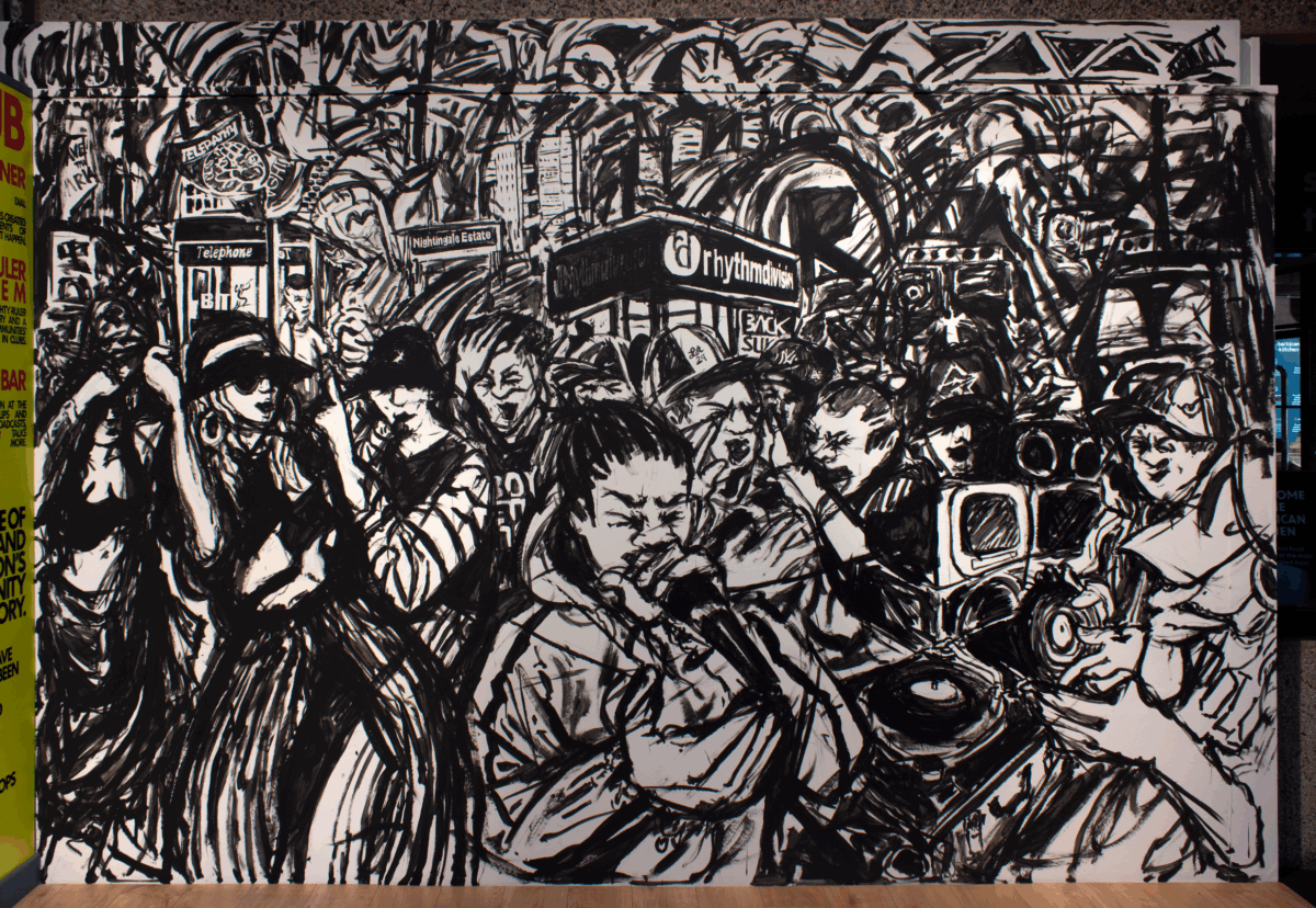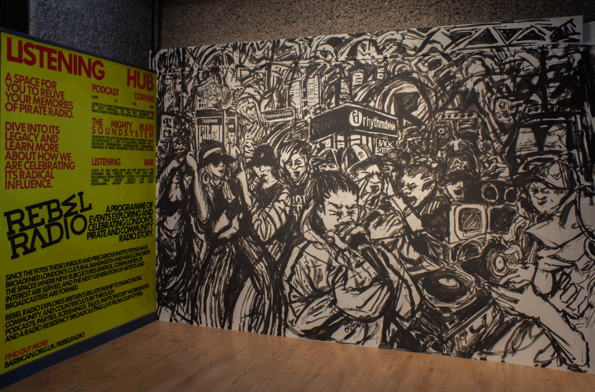 ‘Wot Do U Call It’ for Rebel Radio at the Barbican Arts Centre, 2025, Indian ink, Charcoal Dust & Enamel Paint Mural, 385 x 250 cm